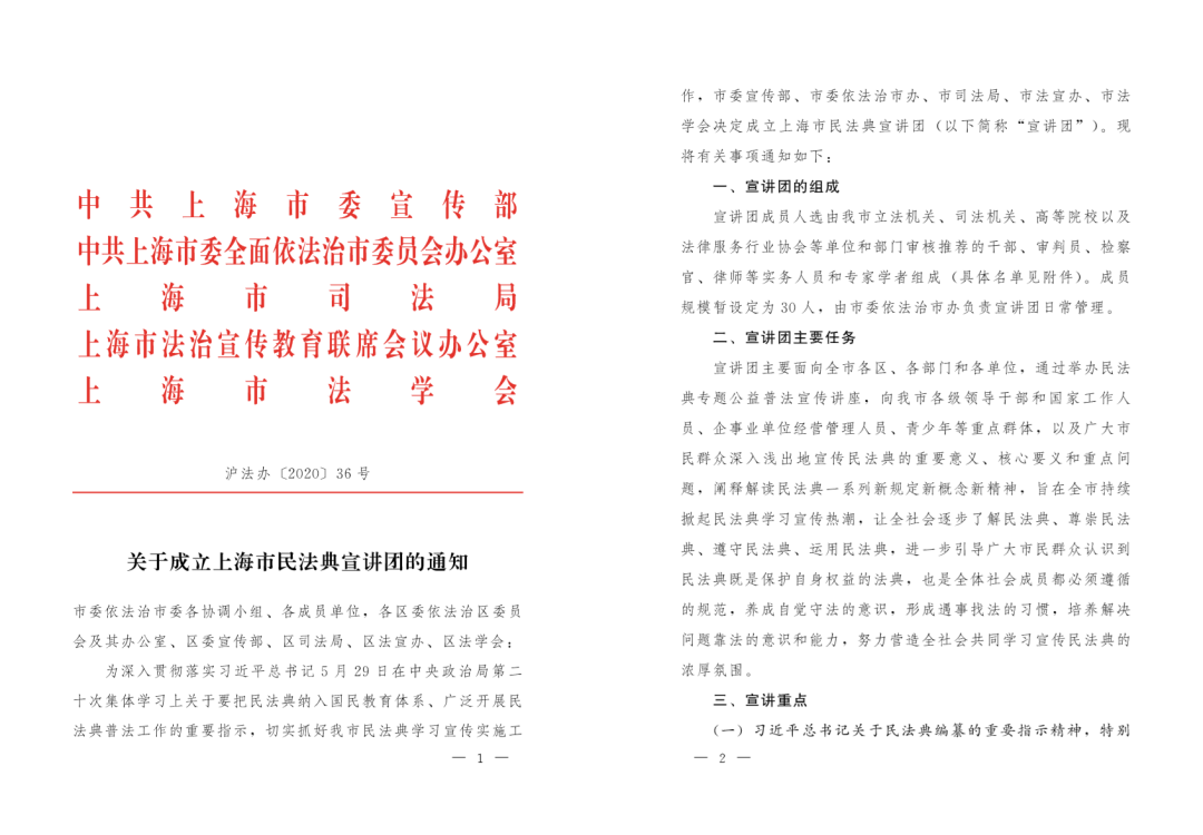 为深入贯彻落实习近平总书记5月29日在中央政治局第二十次集体学习上关于要把民法典纳入国民教育体系、广泛开展民法典普法工作的重要指示,切实抓好我市民法典学习宣传实施工作,市委宣传部、市委依法治市办、市司法局、市法宣办、市法学会决定成立上海市民法典宣讲团(以下简称“宣讲团”)。现将有关事项通知如下: