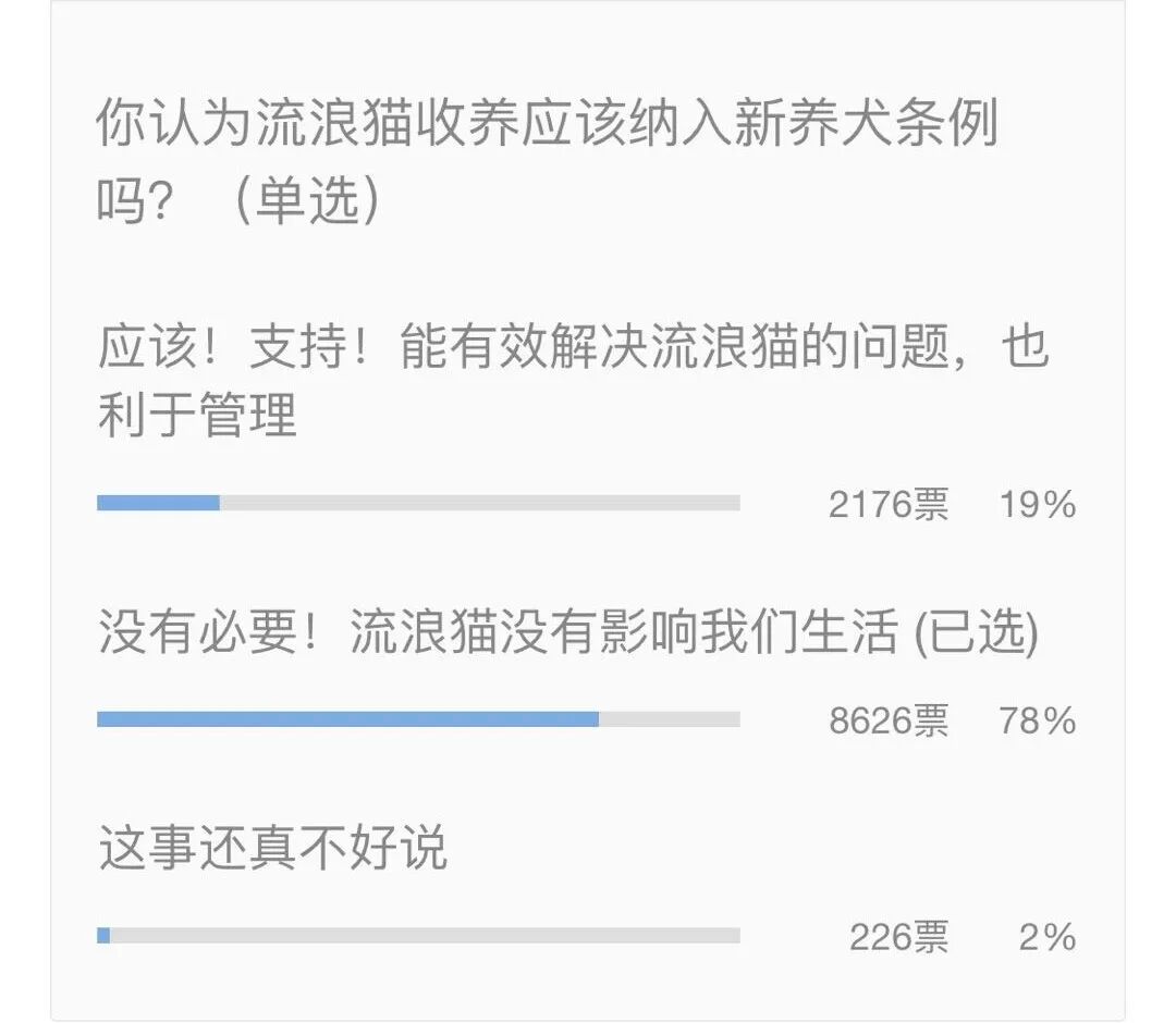“上海法治报”微信公众号在7月21日发起的相关投票结果:近八成网友认为流浪猫对自己的生活没有造成影响,没有必要纳入养犬条例;只有近两成网友对“将流浪猫收养纳入养犬条例”表示支持”。