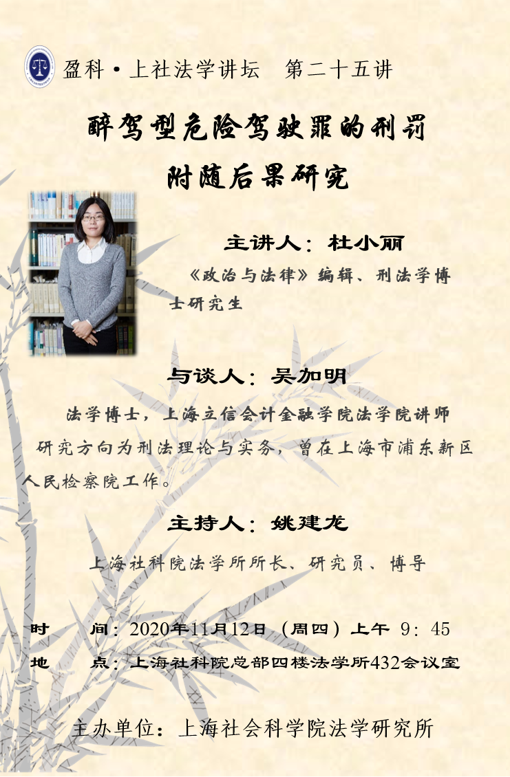 2020年11月12日上午,“盈科·上社法学讲坛”第二十五讲在法学所432会议室顺利举行。《政治与法律》编辑部杜小丽编辑作了题为“醉驾型危险驾驶罪的刑罚附随后果研究”的主题报告。上海立信会计金融学院法学院讲师吴加明博士担任与谈人,法学所姚建龙所长主持了本次活动。杜小丽编辑首先介绍了本次讲座的选题背景并提出问题:醉驾型危险驾驶罪的刑罚附随后果是否存在法理基础。杜小丽编辑通过具体数据,对醉驾入刑是否实现了立法者的立法预期进行实证研究。她罗列了我国该罪的刑罚附随后果的各种具体形态,如职业禁止、资格限制、在信誉及荣誉方面的限制等,并认为醉驾型危险驾驶罪的刑罚附随后果与前置条件之间无逻辑相关性。刑罚附随后果的广泛性还带来了一系列的问题,其破坏了法治原则,违反了比例原则以及与法律保留原则存在冲突。在讲座的最后,杜小丽编辑针对应如何限制醉驾型危险驾驶罪广泛的刑罚附随后果问题提出了解决思路,她认为在轻微罪名将不可避免的逐渐增多的背景下,应推进实现犯罪分层制度并以此推动刑罚附随后果的分类制度,逐步建立轻微罪体系。吴加明博士在与谈中表示,本次讲座的选题有着深刻的实践意义,同时认为刑罚附随后果的严厉性甚至超过了刑罚本身,应该对其进行限制。其后,他指出导致刑罚附随后果过于严厉的原因并非来自刑法层面,而来自于刑罚执行完毕后各个部门的政策。另外,吴加明博士从实务层面介绍了醉驾型危险驾驶罪的司法现状与特征,同时结合其特征论述了该罪在实务中多发的原因。最后,吴加明博士结合自身的司法实践经历提出了解决该问题的方法,他认为对于醉驾型危险驾驶罪,检察机关应大胆使用相对不起诉与存疑不起诉制度。在自由讨论环节,法学所尹琳副研究员发言参与讨论。她简要介绍了日本学界对刑罚附随后果的讨论,如在教师对学生的性骚扰犯罪中,是否应禁止罪犯终身不得从事教师行业。讨论的要点为,永久剥夺其从事教师行业的资格是否违反了宪法对于公民拥有选择职业的权利和自由的规定,另外,对于改邪归正的罪犯来说采取终身禁止的措施并不公平。其后,法学所肖军副研究员对日本刑法关于刑罚附随后果的相关规定进行了补充。盈科全国刑民交叉法律专业委员会主任蔡正华律师高度评价了本次讲座。他认为,近年来醉驾型危险驾驶罪等轻罪案件数量庞大,对于后续如何使罪犯回归社会仍然是一个尚待研究的问题,杜小丽编辑的报告非常具有实践价值。我国刑罚附随后果与刑罚的匹配制度并未完全建立,除了醉驾型危险驾驶罪以外,我们还需要明晰其他各罪的刑罚附随后果。最后,姚建龙所长对讲座进行了总结。他首先感谢了杜小丽编辑的认真准备及吴加明博士的精彩与谈,随后针对本次讲座的内容发表了自己的观点。首先,姚建龙所长认为我国刑法对社会的回应性立法有过头的趋势,就醉酒驾驶而言,醉驾入刑所达到的效果还有其他的可替代方式。其次,刑法过度介入社会治理的问题也需要我们认真反思,对于醉酒驾驶等刑法已经介入的问题,我们仍然需要继续研究以减轻其负面影响。最后,日常生活行为犯罪化的问题需要引起我们的重视,日常生活行为入刑一定要慎之又慎。