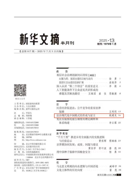 近日,上海社科院党委副书记、法学所所长姚建龙研究员刊发于《政治与法律》2025年第2期的《法治现代化中国模式的形成与证立——再论中国式现代化进程中的法治》一文,被《新华文摘》2025年第13期转载。