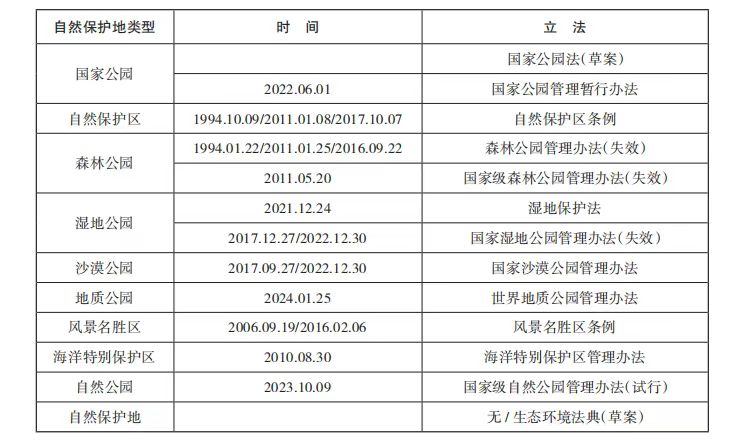 与此轮体制改革同步进行的自然保护地法律体系建设方面,我国已发布第一批5家国家公园名录,即将发布第二批名录,《国家公园法(草案)》经过了第二次公开征求意见阶段。《自然保护区条例》沿用至今,暂未进行修改。国家林业和草原局在2023年10月9日印发了《国家级自然公园管理办法(试行)》(以下简称《办法》),第2条规定我国的自然公园是指纳入自然保护地体系内的自然生态系统、自然遗迹和自然景观的统称,包括风景名胜区、森林公园、地质公园、海洋公园、湿地公园、沙漠(石漠)公园和草原公园等,可见《办法》对除自然保护区和国家公园以外的几类重要的自然保护地类型进行了统领性规制。总体而言,自然保护地法律体系中的单项立法层级虽然并不高,除《湿地保护法》已经生效之外,其他分散性规定层级均较低,但法律体系已经基本建成(见表2)。对于未来是否需要起草一部统领性的《自然保护地法》,《自然保护地法》与《国家公园法》的关系是怎么样的,自然保护地法律体系中的单行立法与全国人大正在起草的《生态环境法典》之间的关系是怎么样的,以及对各类自然保护地单行立法以及行政法规中的保护理念、原则、制度如何进行理论化抽象化,如何纳入《生态环境法典》等,均是需要探讨的课题。