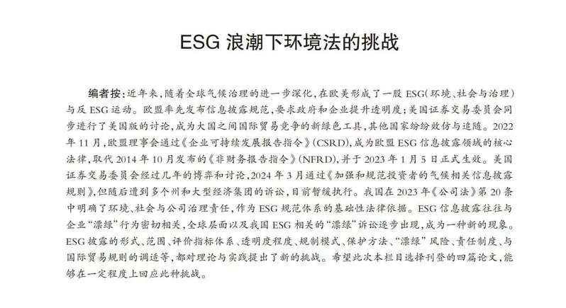 来源:《政治与法律》2025年第8期“主题研讨——ESG浪潮下环境法的挑战”栏目。因篇幅较长,已略去原文注释。