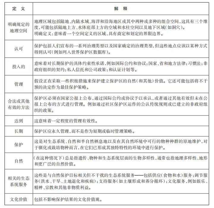 对自然保护地如何定义,类型有哪些比较法上并不统一,全球也未能建立统一标准。目前全球比较通用的标准为IUCN指南,奈杰尔·达德利在报告中将“保护地”定义为“明确界定的地理空间,通过法律或其他有效手段得到认可、专用和管理,以实现对自然与相关生态系统服务和文化价值的长期保护”。IUCN这一定义中的每个英文单词和短语都具有明确规定的含义,奈杰尔·达德利对各要素进行了解释(见表1)。