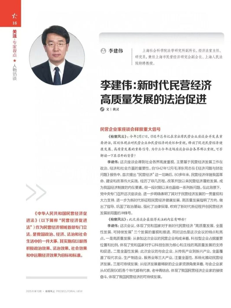 李建伟:本人非常有幸2023年接到上海市人大、社科院下达的任务,研究形成了《关于制定<民营经济促进法>的议案》研究成果,并作为2024年3月全国人大上海代表团议案提交,后被全国人大立案办理。《议案》包括立法草案建议稿53条,基本为后续立法采纳。2024年6月,我参加了司法部民营经济促进法立法调研。后期,我们上海社会科学院法学研究所会同上海市民营经济研究会等单位召开多次研讨会,共同提交了3份、60余条立法修改完善建议。所提建议中,关于进一步明确民营经济主体地位作用、民营经济科技创新支持、民营企业社会贡献确认激励、增设商会条款等建议被采纳。