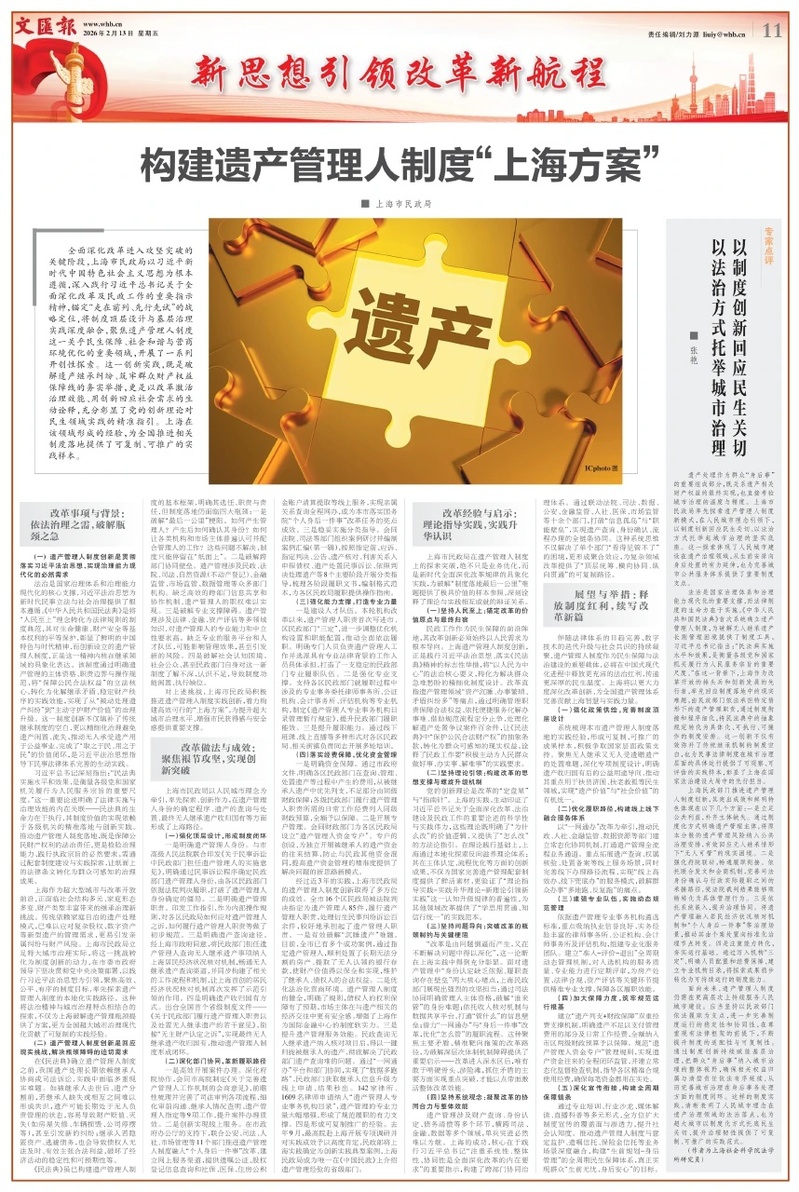 遗产处理作为群众“身后事”的重要组成部分,既关系遗产相关财产权益的最终实现,也直接考验城市治理的温度与精度。上海市民政局率先探索遗产管理人制度新模式,在人民城市理念引领下,以制度创新回应民生关切、以法治方式托举起城市治理的坚实底座。这一探索体现了人民城市建设在遗产治理领域,从生前安排向身后处置的有力延伸,也为完善城市公共服务体系提供了重要制度支点。