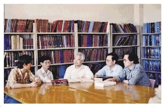 上世纪80年代,高铭暄(左三)与他指导的4名博士生在研讨刑法问题。