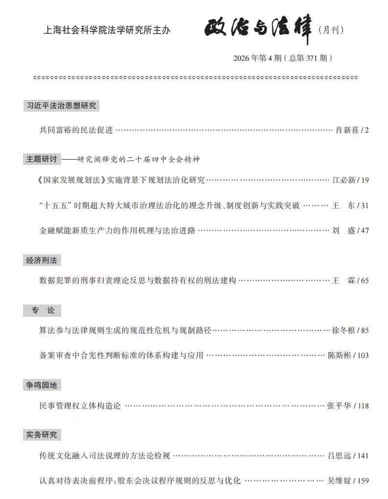 摘要:算法技术对法律规则生成过程的重构,正引发规范性危机。在数字法学视角下,法律规则生成方式的数字化转型成为算法时代的必然趋势,国家中心主义立法范式由此面临算法权力的颠覆性挑战。实验法理学的实证分析表明,算法在法律规则“发现-验证-优化”的全周期中构建起动态演化的数字法秩序。算法参与法律规则生成本质上是技术理性与法律价值之间的博弈,其规范性困境根植于算法权力与立法主权的结构性张力,具体表现为法律规则生成算法化导致的民主赤字、技术寡头规则越界引发的主体危机及形式理性蚕食实质正义的价值侵蚀。算法正义的实现需要搭建三维协同治理框架:以程序协同为支撑,构建多元主体参与的算法规则生成协商机制;以权力制衡为核心,构建算法规则生成权限的规范化约束机制;以价值校准为导向,构建算法规则生成的实质正义审查机制。由此,为算法时代法律规则生成范式转型提供理论解释与制度设计双重维度的创新性解决方案。